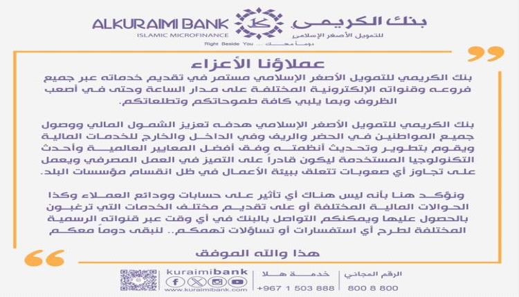 مراقبون برس ينشر نص بيان صادر عن بنك الكريمي للتمويل الأصغر الإسلامي لكافة عملائه في الآتي: