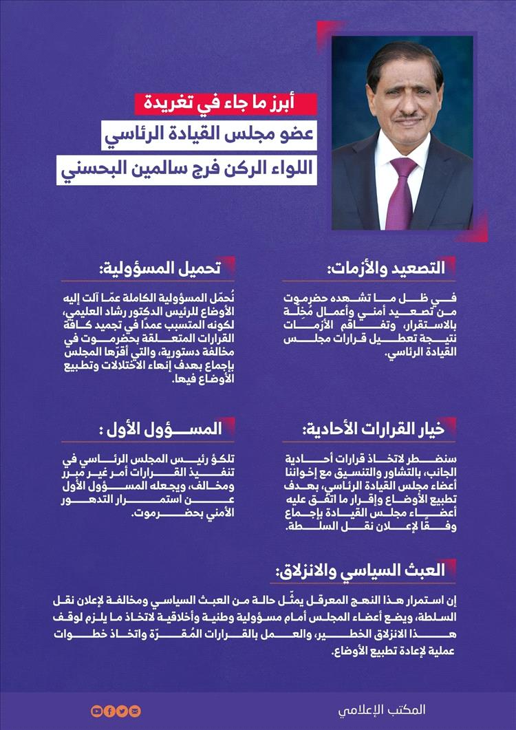 اللواء البحسني يفضح العليمي كمعطل لقرارات الإجماع الرئاسي.