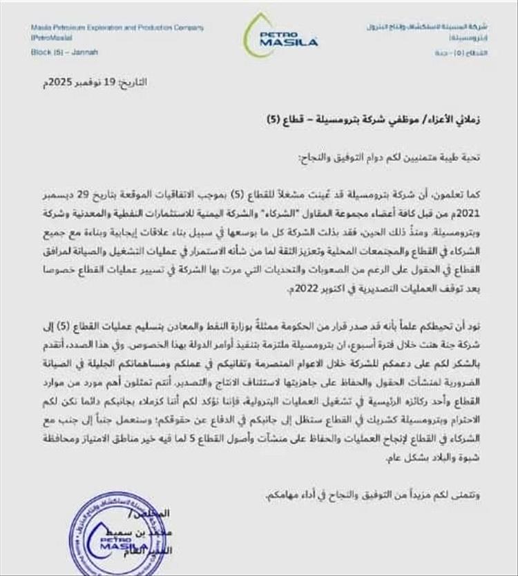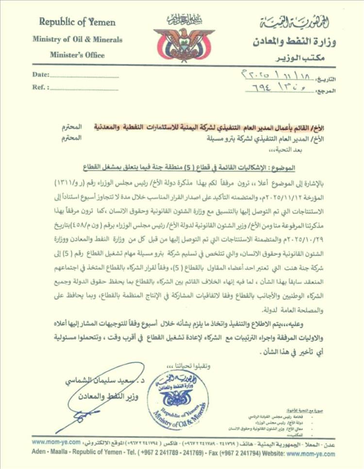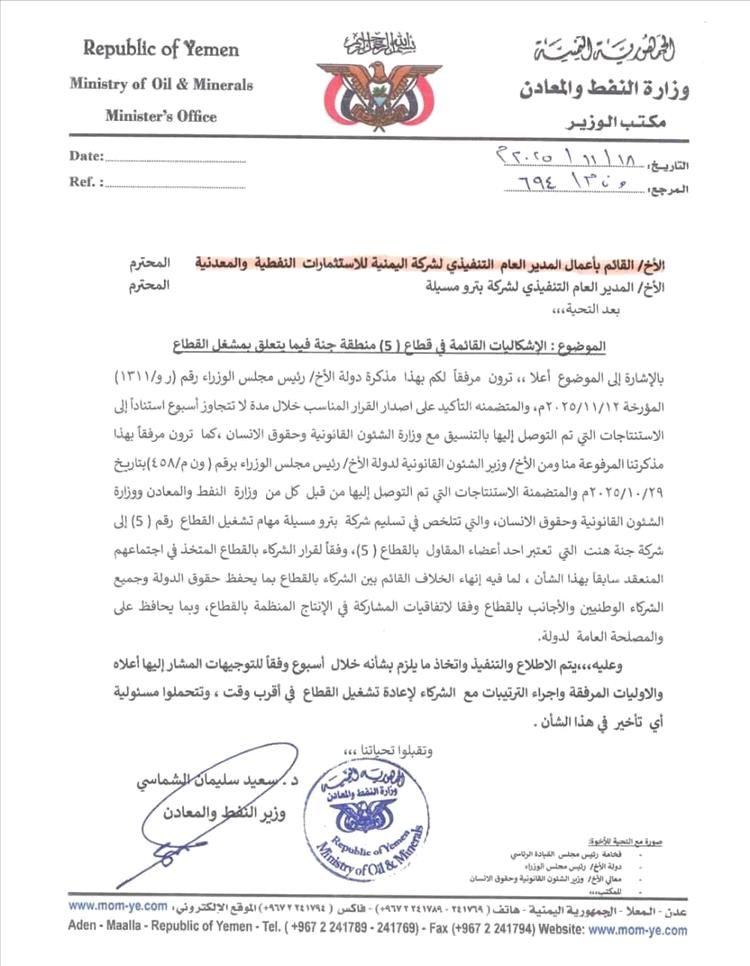 كشفت وثائق حكومية رسمية عن استعجال حكومي مثير للاستغراب لتسليم أحد أهم القطاعات النفطية بمحافظة شبوة إلى شركة أمريكية بالإسم، وحرص كبير من وزير النفط سعيد الشماسي لالزام الشركة اليمنية للاستثمارات النفطية وشركة بترومسيلة الحكومية بالإلتزام بمدة الأسبوع المحددة لتسليم القطاع النفطي رقم 5 لشركة جنة هينت وتمكينها من إعادة تشغيل القطاع واستئناف الإنتاج النفطي، بدلا من كل المشغلين الآخرين للقطاع وفقاً لتوجيهات رئيس الحكومة بالتنسيق مع وزارة الشؤون القانونية وحقوق الإنسان وبعيدا عن أي موافقه برلمانية.