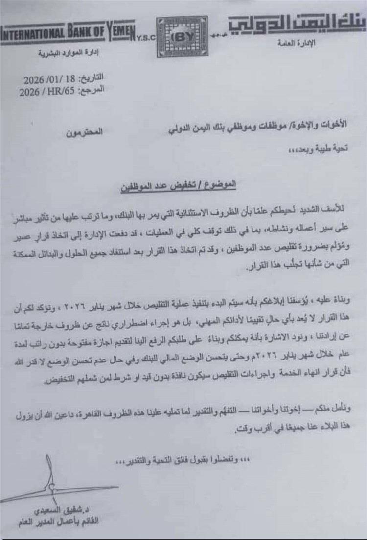 اعلن بنك اليمن الدولي رسميا توقف �كافة عملياته� المصرفية، وتخفيض عدد موظفيه ومنحهم إجازة مفتوحة دون راتب، بداية من شهر يناير 2026، نتيجة مايمر بها من �ظروف استثنائية� في مؤشر على بدء العد التنازلي لإفلاسه، على إثر العقوبات الامريكيه التي فرضت عليه بتهم دعم الحوثيين كمنظمة إرهابية.