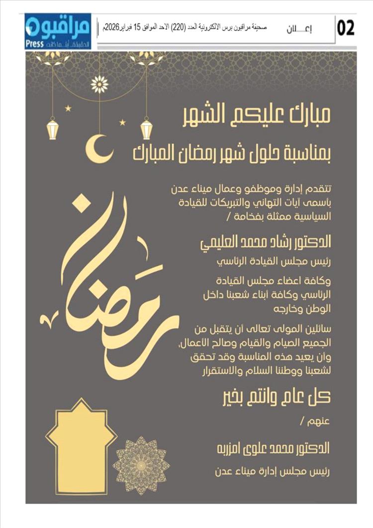 تقدمت قيادة ومظفوا وعمال ميناء عدن برفع اصدق التهاني والتبريكات للقيادة السياسة ممثلة بفخامة الرئيس الدكتور /رشاد محمد العليمي رئيس مجلس القيادة الرئاسي وجميع أعضاء مجلس القيادة الرئاسي، ولكافة ابناء الشعب في داخل الوطن وخارجه بمناسبة قرب قدوم شهر رمضان المبارك 2026م.
