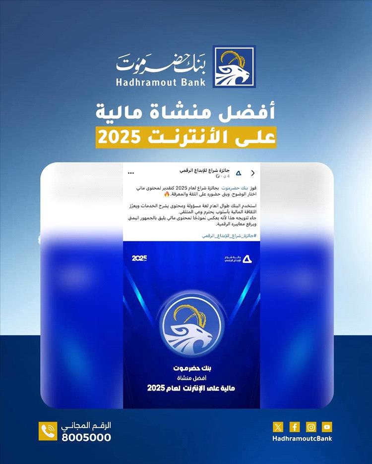 حصد بنك حضرموت جائزة "شراع للإبداع الرقمي" 2025 وذلك تتويجاً لتميزه كأفضل منشأة مالية رقمية في اليمن.