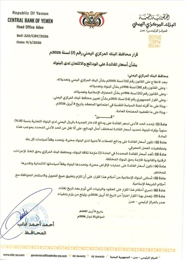 قال الصحفي المختص بالشأن الاقتصادي ماجد الداعري بأن محافظ البنك المركزي أحمد بن أحمد غالب يقرر تحديد الحد الأدنى لنسبة الفائدة لودائع الادخار الجديدة بالريال اليمني لدى البنوك التجارية ب18% سنويا، وكأسعار فائدة ملزمة لكل البنوك ويحتفظ البنك المركزي بمعاقبة المخالفين، إضافة إلى تحرير أسعار الفائدة على ودائع العملات الأجنبية لدى البنوك وتحديدها وفقا لسياسات كل بنك ومقتضيات العمل المصرفي.